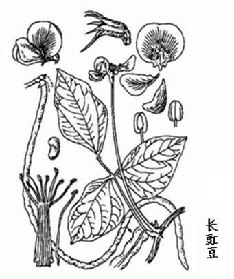 长豇豆属一年生缠绕草本。茎无毛或近无毛。三出复叶,顶端小叶菱形,先端急尖,两侧小叶斜阔椭圆形,长7-14cm,宽5-8cm;托叶菱形,两端渐狭急尖,下部1/3处着生茎上。花冠蝶形,淡紫色而带黄白,长1.9-2.5cm,具短柄。花序2-3朵花,较叶短;小苞片匙形,顶端急尖,早落;萼钟状,无毛,皱缩,萼齿5,线披针形;翼瓣有截形耳,龙骨瓣无耳;子房无毛;腺体筒状,由槽纹,筒口圆齿状;花柱上部里面被髯毛;柱头上面有一三角形突起。荚果厚,肉质,长30-90cm,宽约12mm。种子长圆形,两端圆,长9-13mm,宽5-7mm。花期7-8月,果期8-9月。
