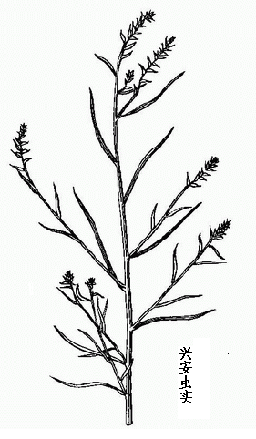 兴安虫实为一年生草本,高10-50cm。茎直立,圆柱形,基部通常红色,有毛或后期脱落。叶互生;叶片线状披针形或条形,长2-5cm,宽2-4mm,先端渐尖或具短尖头。穗状花序通常紧密,狭圆筒状;苞片卵形或长椭圆状卵形,渐尖,边缘宽膜质。花被3,近轴花被片1,宽椭圆形,先端具不规则细齿,远轴两片小,近三角形。基部心形,背面凸起。果卵形或圆卵形,长2.5mm,果翅狭。花果期6-8月。