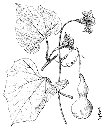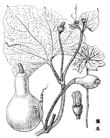 一年生攀援草本。茎、枝具沟纹,被粘质长柔毛,老后渐脱落。叶柄纤细,长16-20cm,被毛;顶端有2腺体;叶片卵状心形或肾状卵形,长、宽约10-35cm,不分裂或3-5裂,具5-7掌状脉,先端锐尖,边缘有不规则的齿,基部心形,弯缺开张,半圆形或近圆形,两面均被微柔毛,叶背及脉上较密。卷须纤细,初时有微柔毛,上部分2歧。雌雄同株,雌、雄花均单生;雄花:花梗细,比叶柄稍长,花梗、花萼、花冠均被微柔毛,花萼筒漏斗状,长约2cm,裂片披针形,长5mm,花冠白色,裂片皱波状,长3-4cm,宽2-3cm,先端微缺而顶端有小尖头,5脉;雄蕊3,花丝长3-4mm,花药长8-10mm,长圆形,药室折曲;雌花花梗比叶柄稍短或近等长;花萼和花冠似雄花;花萼筒长2-3mm;子房中间缢缩,密生粘质长柔毛,花柱粗短,柱头3,膨大,2裂。果实初为绿色,后变白色至带黄色,果形变形较大,因不同变种和品种而异,有呈哑铃状,长数十厘米,有的仅长10cm,有的呈扁球形、棒状或杓状,成熟后果皮变木质。种子白色,倒卵形或三角形,先端截形或2齿裂,稀圆,长约20mm。花期7-8月,果期8-9月。