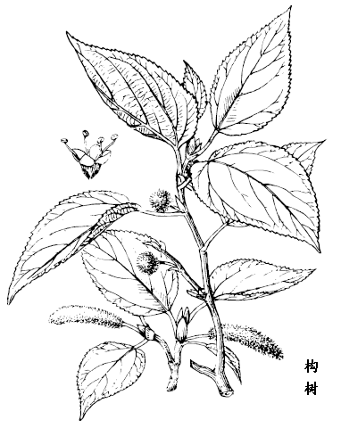 构树属落叶乔木,高达14-16m。有乳汁。小枝粗壮,密生绒毛。单叶互生;叶柄长1.5-10cm,密被柔毛;叶片膜质或纸质,阔卵形至长圆状卵形,长5.5-15(-20)cm,宽4-10(-15)cm,不分裂或3-5裂,尤以幼枝或小树叶较明显,先端渐尖,基部圆形或浅心形,略偏斜,边缘有细锯齿或粗锯齿,上面深绿色,被粗伏毛,下面灰绿色,密被柔毛。花单性,雌雄异株;雄花序为荑花序,腋生,下垂,长3-8cm,总花梗长1-2cm;雌花序为头状花序,直径1-1.5cm,总花梗长1-1.5cm;雄花具短柄,有2-3小苞片,花被4裂,基部合生,雄蕊4;雌花苞片棒状,被毛,花被管状,雌蕊散生于苞片间,花柱细长,线形,被短毛,具粘性。聚花果肉质,呈球形,直径约2cm,成熟时橙红色。花期4-7月,果期7-9月。