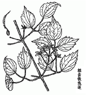 粗齿铁线莲属落叶藤本。小枝密生白色短柔毛,老时外皮剥落。叶对生,一回羽状复叶;叶柄长3.5-6.5cm;小叶通常5枚,小叶片卵形或椭圆状卵形,长5-10cm,宽3.5-6.5cm,先端渐尖,基部圆形、宽楔形或微呈心形,常有不明显3裂,边缘有粗大锯齿状牙齿,两面被短柔毛,有时较疏或近无毛。腋生聚伞花序,常有3-7朵花;萼片4,开展,直径2-3.5cm,白色,近长圆形,长1-1.8cm,宽约5mm,先端钝,外面有短柔毛,内面有时近无毛;花瓣无;雄蕊多数,无毛;心皮多数,被柔毛。瘦果扁卵圆形,长3-4mm,有柔毛;宿存花柱羽毛状,长达3cm。花期5-7月,果期7-10月。