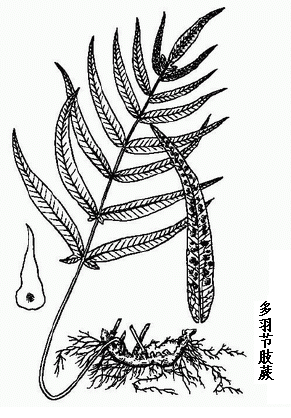 凤尾搜山虎为水龙骨科植物多羽节肢蕨的根茎。呈长圆柱形,一端钻形,稍弯曲,长6-11cm,宽1-1.5cm。表面暗棕褐色,具凹陷的叶痕、残留鳞片及点状根痕。质坚,味苦涩。