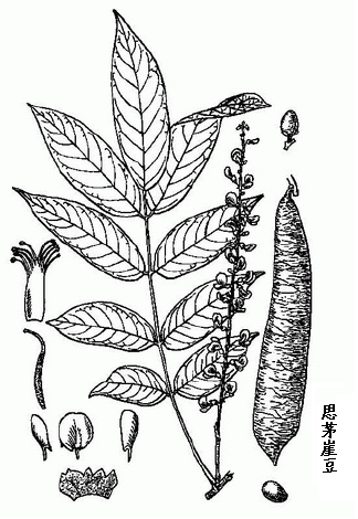 思茅崖豆属乔木,高8-10cm。幼枝被绒毛,后脱落。叶互生,奇数羽状复叶,长达50cm;叶柄长5-6cm;托叶卵状三角形,早落;小叶7-9片,小叶柄长5-6.5mm;叶片窄长圆形,长10-15cm,宽约3-5cm,先端尾尖,基部近圆形,上面无毛,有光泽,下面密生网脉;侧脉8-13对,两面均隆起。总状圆锥花序腋生,长35-45cm,宽约4cm,被柔毛;花梗长约1.5cm;萼钟形,萼齿5,上面2个合生;蝶形花冠,花瓣白色;雄蕊10,单体;子房被绢毛。荚果线状长圆形,长7-20cm,宽3.2-4cm,革质,开裂后果瓣扭曲,被锈褐色柔毛或无毛。种子1-2颗,黄色,有光泽,扁圆,凸镜形。花期4月。