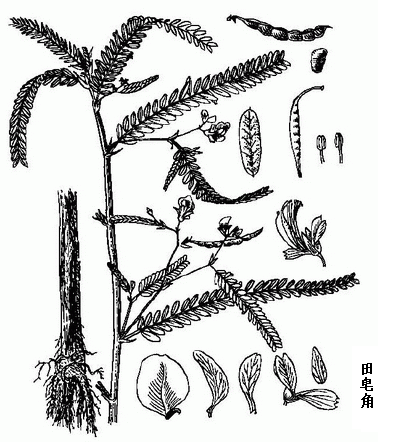 田皂角属一年生亚灌木状草本,高30-100cm,无毛;多分枝。偶数羽状复叶,互生;托叶膜质,披针形,长约1cm,先端锐尖,小叶20-30对,长圆形,长3-8mm,宽1-3mm,先端圆钝,有短尖头,基部圆形,无小叶柄。总状花序腋生,花少数,总花梗有疏刺毛,有粘质;膜质苞片2枚,边缘有锯齿;花萼二唇形,上唇2裂,下唇3裂;花冠黄色,带紫纹,旗瓣无爪,翼瓣有爪,较旗瓣稍短,龙骨瓣较翼瓣短;雄蕊10枚合生,上部分裂为2组,每组有5枚,花药肾形;子房无毛,有子房柄。荚果线状长圆形,微弯,有6-10荚节,荚节平滑或有小瘤突。花期夏秋,果期10-11月。