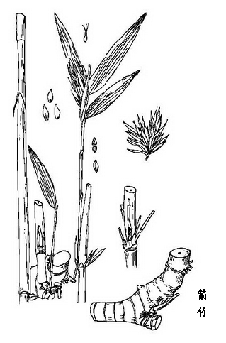 箭竹的植株呈灌木状。地下茎为单轴型。竿高l-4m,节间长4-7cm,粗1.2-3mm,棕紫色,每节簇生多数小枝。叶鞘在每一具叶小枝上为少数乃至数枚,长2-3cm,无毛,常为棕红色,最上1枚常于鞘口具繸毛;叶片长6-10cm,宽6-11mm,无毛,次脉3-4对,小横脉明显。总状花序顶生,长2.5-4cm,密生偏于一侧的多数小穗,花序下托以数枚佛焰苞。因最上的苞片等长或超过花序,致使小穗从一侧外露;小穗长12-16mm,含2-4花,成熟时呈紫色或黄棕色。花期4月,果期5月。