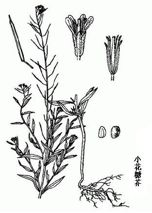 桂竹糖芥为十字花科植物小花糖芥的全草和种子。茎圆柱形,长10-45cm,黄绿色,有纵棱和贴生的毛茸。基生叶莲座状,条形羽状分裂,无叶柄;茎生叶披针形或条形,全缘或具波状齿,两面有毛茸。长角果微扁,四角形或近圆柱形,长2-2.5cm。种子椭圆形,略具三棱,长约0.8mm,宽约0.4mm,顶端圆或平截,基部略尖或微凹,有白色短小的种柄,表面黄褐色,具微细的网状瘤点样纹理及2条纵列浅槽;种皮薄,无胚乳,胚根背倚,子叶2片折叠。气微,味苦。