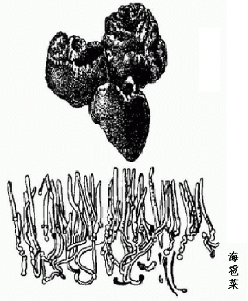 海雹菜为鞭枝藻科植物海雹菜的藻体。藻体蓝绿色或亮绿色,呈扁球形,膨胀呈囊状,直径5mm,大的可达5cm以上,表面光滑或凹凸不平。