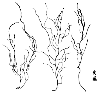 海蕴为海蕴科植物海蕴的藻体。藻体卷曲成团,黑褐色至灰黄绿色。水浸展平后呈线形,长8~25cm,枝近互生,呈不规则二叉式分枝。柔软而粘滑。质脆易碎,断面常中空。气微腥,味咸。