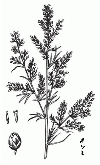 黑沙蒿属半灌木,高50-100cm。主根粗而长,木质,侧根多数;根状茎粗壮,直径1-3cm,有多数营养枝。茎多分枝,茎皮老时灰黑色,缝裂,当年枝外皮灰黄色,不育枝紫红色。叶黄绿色,多少肉质,无毛,干后坚硬;茎下部叶宽卵形,一至二回羽状全裂,每侧有裂片3-4枚,叶柄短;中部叶长3-7cm,宽2-4cm,一回羽状全裂,裂片2-3对,狭条形,长1.5-3cm,宽约1mm;上部叶短小,3裂或不裂,裂片狭线形,无柄;苞片叶3全裂或不裂。头状花序多数,在茎顶和枝上排列成复总状花序,有短梗和条形苞叶;总苞片卵形,长3mm;总苞片3-4层,宽卵形,边缘宽膜质,背面黄绿色;外层雌花10-14朵能育,内层两性花,5-7朵不育,子房退化。瘦果倒卵形,果壁上具细纵纹并有胶质物。花、果期7-10月。