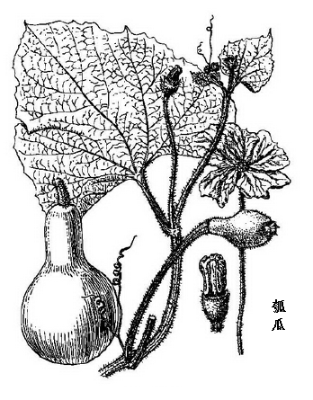 1. 葫芦属一年生攀援草本。茎、枝具沟纹,被粘质长柔毛,老后渐脱落。叶柄纤细,长16-20cm,被毛;顶端有2腺体;叶片卵状心形或肾状卵形,长、宽约10-35cm,不分裂成3-5裂,具5-7掌状脉,先端锐尖,边缘有不规则的齿,基部心形,弯缺开张,半圆形或近圆形,两面均被微柔毛,叶背及脉上较密。卷须纤细,初时有微柔毛,上部分2歧。雌雄同株,雌、雄花均单生;雄花:花梗细,比叶柄稍长,花梗、花萼、花冠均被微柔毛,花萼筒漏斗状,长约2cm,裂片披针形,长5mm,花冠白色,裂片皱波状,长3-4cm,宽2-3cm,先端微缺而顶端有小尖头,5脉;雄蕊3,花丝长3-4mm,花药长8-10mm,长圆形,药室折曲;雌花花梗比叶柄稍短或近等长;花萼和花冠似雄花;花萼筒长2-3mm,子房中间缢缩,密生粘质长柔毛,花柱粗短,柱头3,膨大,2裂。果实初为绿以,后变白色至带黄色,果形变形较大,因不同变种和品种而异,有呈哑铃状,长数十厘米,有的仅长10cm,有的呈扁球形、棒状或杓状,成熟后果皮变木质。种子白色,倒卵形或三角形,先端截形或2齿裂。稀圆,长约20mm。花期7-8月,果期8-9月。