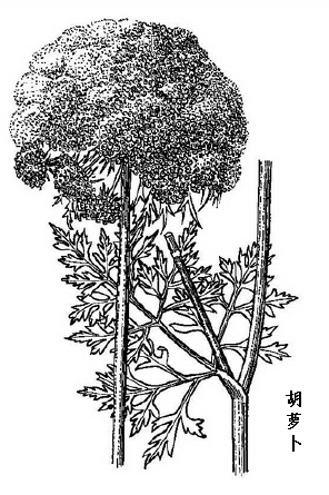 胡萝卜属二年生草本,高达120cm。根肉质,长圆锥形,粗肥,呈橙红色或黄色。茎单生,全株被白色粗硬毛。基生叶叶柄长3-12cm;叶片长圆形,二至三回羽状全裂,末回裂片线形或披针形,先端尖锐,有小尖头;茎生叶近无柄,有叶鞘,末回裂片小或细长。复伞形花序;花序梗长10-55cm,有糙硬毛;总苞片多数,呈叶状,羽状分裂,裂片线形;伞辐多数,结果期外缘的伞辐向内弯曲;小总苞片5-7,不分裂或2-3裂;花通常白色,有时带淡红色;花柄不等长。果实圆卵形,棱上有白色刺毛。花期5-7月。