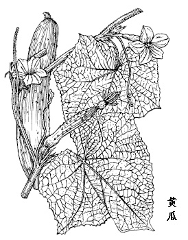 黄瓜属一年生蔓生草本。茎枝伸长,有纵沟及棱,被白色硬糙毛。卷须细,不分枝,具白色柔毛。单叶互生;叶柄稍粗糙;叶片三角状宽卵形,膜质,长、宽均12-18cm,两面甚粗糙,掌状3-5裂,裂片三角形并具锯齿,有时边缘具缘毛。花单性,雌雄同株;雄花,常数朵簇生于叶腋,花梗细,被柔毛,花萼简狭钟状圆筒形,密被白色长柔毛,花萼裂片钻形,开展与花萼近等长;花冠黄白色,长约2cm,花冠裂片长圆状披针形,急尖;雄蕊3,花丝近无;雌花单生,或稀簇生,花梗粗壮,被柔毛。子房纺锤形,柱头3。果实长圆形或圆柱形,长10-30(-50)cm,熟时黄绿色,表面粗糙,具有刺尖的瘤状凸起,极稀近于平滑。种子小,狭卵形,白色,无边缘。花、果期为夏、秋季。