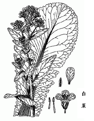 黄芽白菜为十字花科植物白菜的鲜叶和根。叶球呈圆球形、椭圆形或长圆锥形。茎缩短,肉质,类白色,被层层包叠的基生叶包裹。基生叶倒宽卵形、长圆形,长30-60cm,宽约为长的一半。外层叶片绿色,内层叶片淡黄白色至白色,先端钝圆具波状缘或细齿,中脉宽,细脉明显,呈凹凸不平的网状,叶片上端较薄,下部较厚,肉质,折断有筋脉。干燥叶黄棕色。气微,味淡。