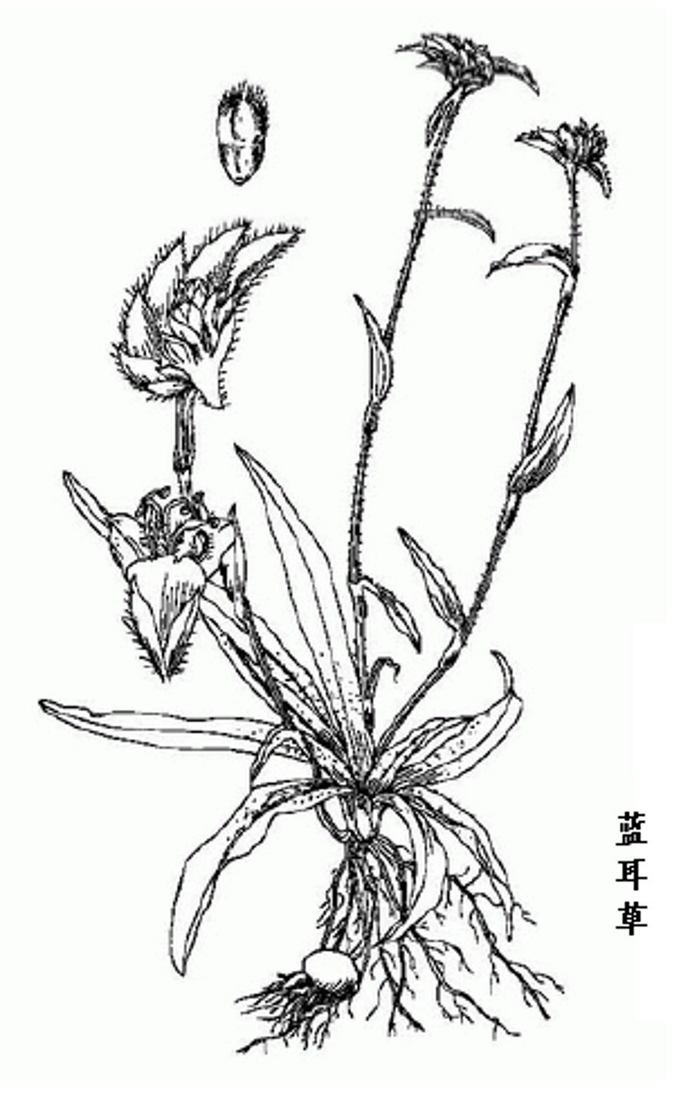 蓝耳草属多年生直立或披散小草本,高可达30cm。植株常被白色疏长绵毛,或有时近无毛。地下鳞茎球形,密被白色毛,有多数须根。叶互生;叶片披针形,狭长圆形或近线形,基生叶较大,长3-8cm,宽5-12mm,茎生叶较小,先端渐尖或略钝,基部下延,两面被稀疏短绵毛。聚伞花序顶生或腋生;总苞片与叶相似,长2-5cm;苞片镰刀状长圆形,长5-10mm,边缘具毛;萼片3,披针形,基部连合,长约5mm,背面被白色绵毛;花天蓝色,花瓣3,匙状长圆形,两端分离,中部合生成筒,长5-8mm;雄蕊6,全育,花丝上部密被淡蓝色绵毛;子房长圆形,先端被硬毛,3室,花柱线形,长约7mm,先端稍膨大。蒴果倒卵状三棱形,先端被细长硬毛,每室有种子1-2颗。种子表面有网纹和窝孔。花期7-9月。 |