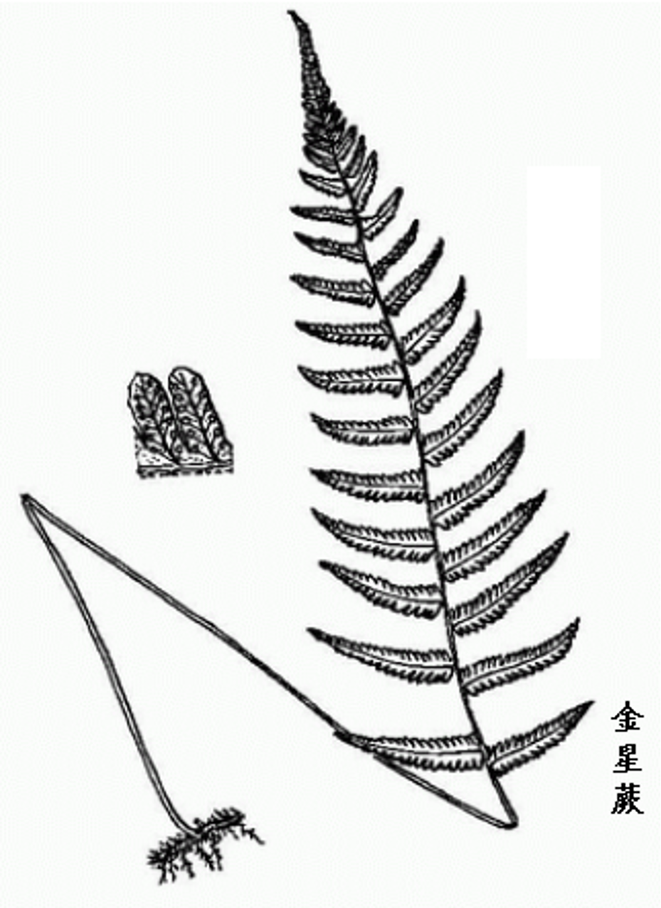 金星蕨的植株高40-60cm。根茎长而横生,顶部疏被黄褐色、披针形鳞片。叶近生或远生;叶柄长15-20cm,禾秆色,基部稍呈黑色并疏被鳞片,上面有浅沟,密被灰白色短针状毛;叶片草质,披针形或长圆状披针形,长20-40cm,宽5-10cm,先端渐尖并为羽裂,基部不缩狭,下面被橙黄色球形腺体及短毛,叶轴和羽轴两面有少数短针状密毛,二回羽裂;羽片10-15对,互生,略斜向上,无柄,长圆状披针形,长3-6cm,宽1-1.5cm,先端渐尖或长渐尖,基部截形,基部1对不缩短;裂片14-18对,长3-6mm,宽2-2.5mm,先端钝或圆钝,全缘;叶脉在裂片上为羽状,侧脉单一,基部1对出自中脉基部。孢子囊群小,圆形,背生于侧脉近先端,靠近叶边;囊群盖大,圆肾形,有灰白色刚毛。 |