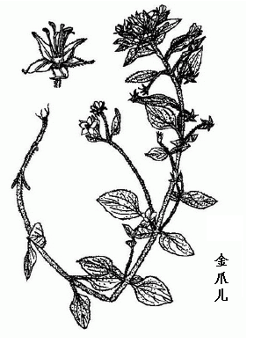 金爪儿属多年生草本。茎簇生,柔弱倾斜,高13-35cm。圆柱形,基部直径约1mm,向上稍增粗,密被多细胞淡黄色多节柔毛,有黑色腺条,通常多分枝。叶在茎下部对生,在上部互生;叶柄长4-15mm;叶片卵形至三角状卵形,长1.3-3.5cm,宽8-2.5cm。骤然收缩下延,两面均被多细胞柔毛,密布长短不等的黑色腺条。花两性,单生于茎上部叶腋;花梗纤细,丝状,通常超过叶长,密被柔毛,花后下弯;花萼长约7mm,5分裂近达基部,裂片卵状披针形,先端长渐尖,边缘具缘毛,背面疏被柔毛和紫黑色腺条;花冠黄色,长6-9mm,5裂,基部合生部分长0.5-1mm,裂片卵形或菱状卵圆形,宽3-5mm,先端稍钝;雄蕊5,花丝下部合生成高约0.5mm的环,分离部分长1.5-2.5mm,内面有毛,花药长约2mm,长圆形;子房上位,具淡褐色毛,心皮5,1室,花柱长约4.5mm,柱头头状。蒴果近球形,淡褐色,直径约4mm,稍具5棱,表面具多细胞毛,具宿萼。花期4-5月,果期5-9月。 |