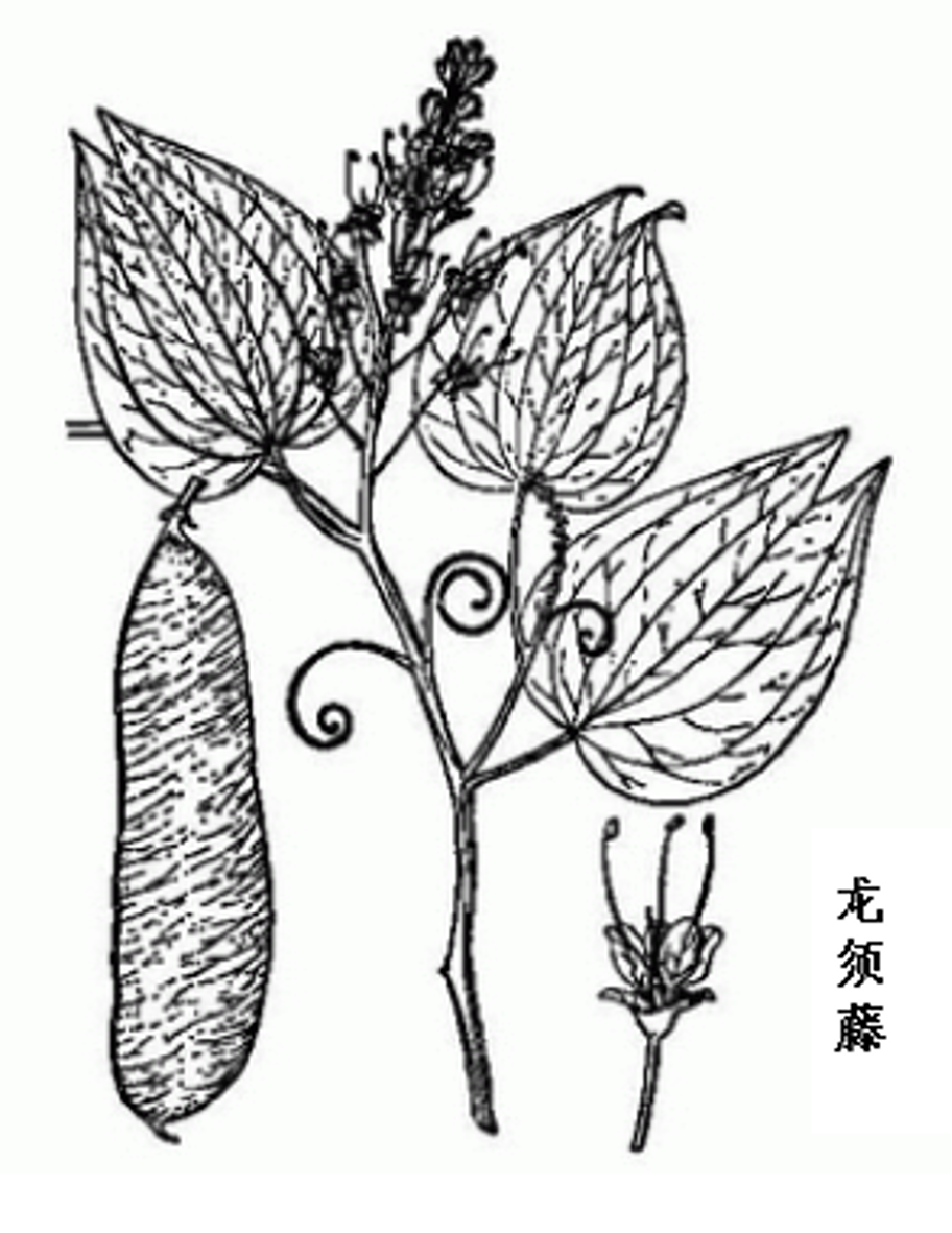 龙须藤属木质藤本;有卷须。嫩枝和花序被紧贴的小柔毛。叶互生;叶柄长1-2.5cm,纤细,略被毛;叶片纸质,卵形或心形,长3-10cm,宽2.5-6.5cm,先端锐渐尖,微凹或2裂以至不裂,基部截形,微凹或心形;上面无毛,下面被紧贴的短柔毛,渐变无毛或近无毛,干时粉白褐色;基出脉5-7条。花两性,总状花序狭长,腋生,有时与叶对生或数个聚生于枝顶而成复总状花序,长7-20cm;苞片与小苞片小,锥尖,早落;花梗纤细,长1-1.5cm;花托漏斗形,长约2mm;萼杯状,裂片5,披针形,长约3mm;花瓣5,白色,具瓣柄,瓣片匙形,外面中部疏被丝毛;能育雄蕊3,无毛,退化雄蕊2;子房具短柄,仅沿两缝线被毛,花柱短,柱头小。荚果倒卵状长圆形或带状,扁平,长7-12cm,宽2.5-3cm,无毛,果瓣革质。种子2-5颗,圆形,扁平,直径约1.2cm。花期6-10月,果期7-12月。