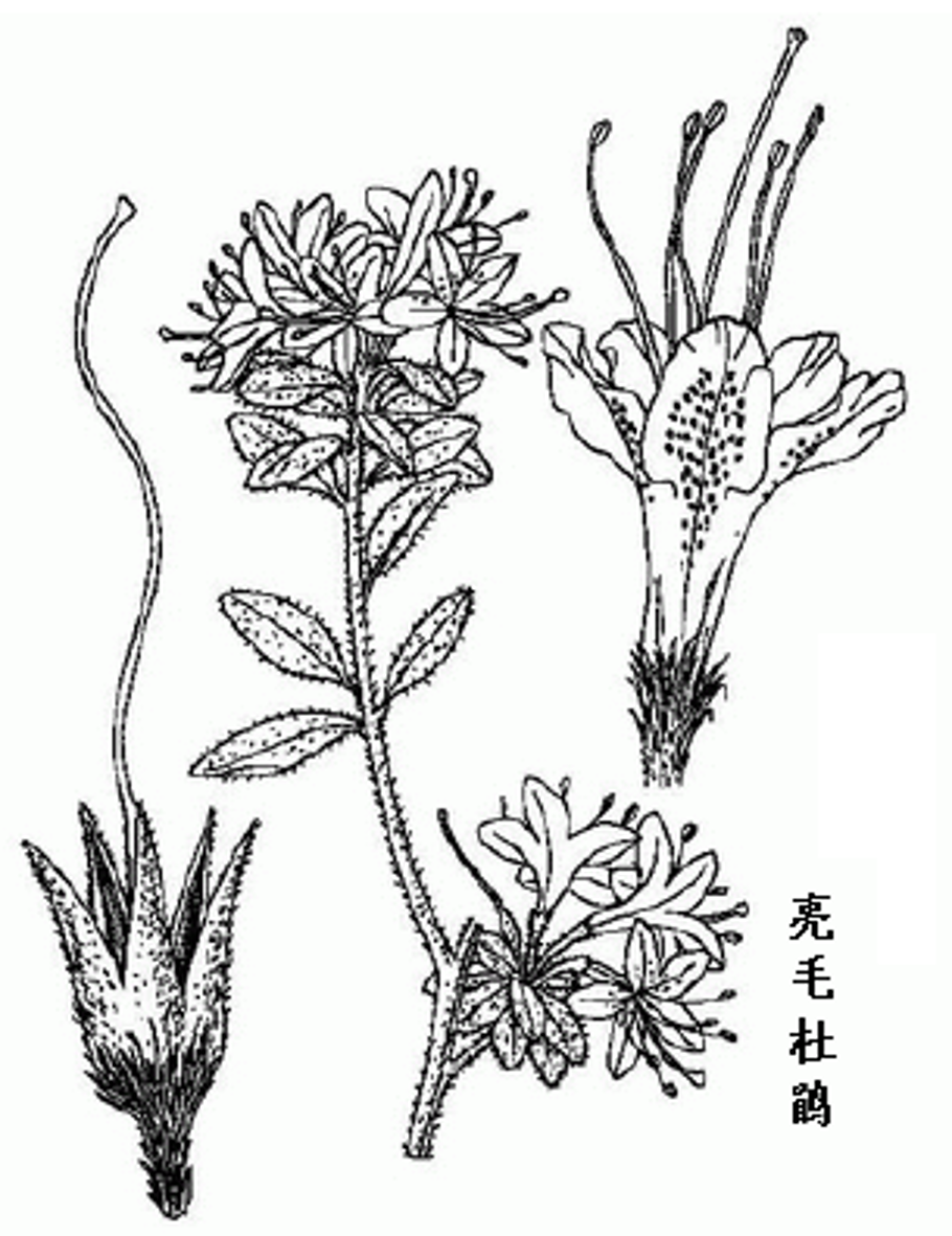亮毛杜鹃属常绿小灌木,高0.5-2m。小枝细而多,淡褐色,密被红棕色伏毛。单叶互生;密集枝顶,叶柄短,长2-5mm,被褐色糙伏毛。叶片革质,椭圆形、椭圆状卵形或长卵状披针形,长1-4.5cm,宽0.5-2cm,先端锐尖、短渐尖或渐尖,基部短楔形,全缘,表面深绿色,伏生疏长毛,背面淡绿色,散生红棕色扁平伏毛,中脉在两面稍明显,侧脉和网脉均不明显。花3-6朵,生于枝顶叶腋,形成伞形或总状花序;花便长3-6mm,有光亮的红棕色细毛;花萼较小,5裂或不裂,长1-4mm,具红棕色细毛;花冠漏斗形,略呈两侧对称,淡紫红色、粉红色,或鲜紫色,5裂,裂片开展,上方3裂片内有深红色斑点;雄蕊5枚,较花冠长,花丝下部被微柔毛,花药顶孔开裂;雌蕊1,子房5室,密被红棕色长糙毛,花柱细长,无毛或基部有毛。蒴果小,卵形,长4-9mm,外面密被红棕色糙伏毛,花柱宿存,熟时5裂。花期3-5月,果期6-7月。