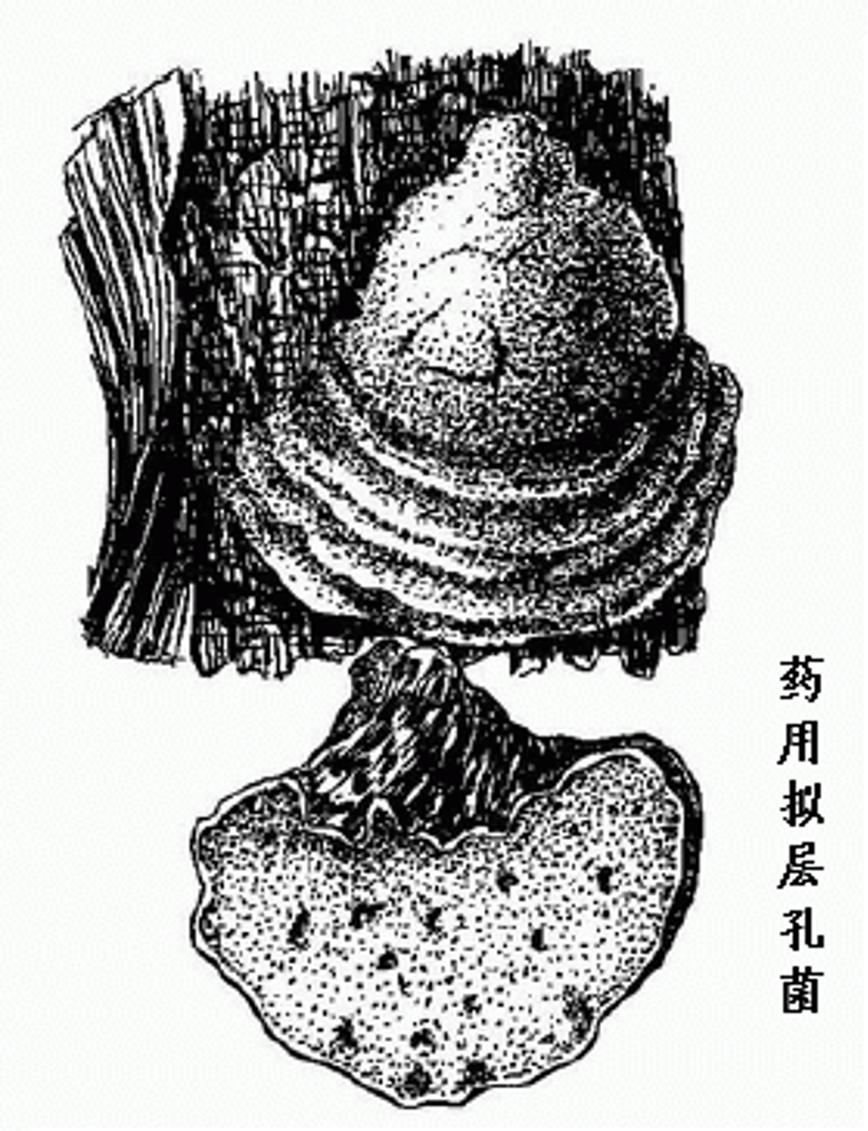 药用拟层孔菌属子实体多年生。木质,蹄形、球形至钟形,侧生无柄,(5-13)cm×(4-19)cm,厚5-18cm。盖面白色至灰白色,常有一层薄薄的绒毡层,后渐脱落至光滑,有污白色至土黄色的污斑,老熟后呈淡灰黑色,表面变粗糙,出现不规则的龟裂;盖缘钝,全缘。管口面白色;管口圆形,管壁较厚,每1mm间4个,老熟后或干后管口面呈污灰色至淡灰黑色;菌管多层,每层厚约1cm,初期白色,后期渐成淡黄色。菌肉灰白色,幼时近肉质,软而脆,老熟后成白垩质或干酪质,易碎,味甚苦。孢子卵圆形,光滑,无色,(4-5)μm×(3.5-4)μm。