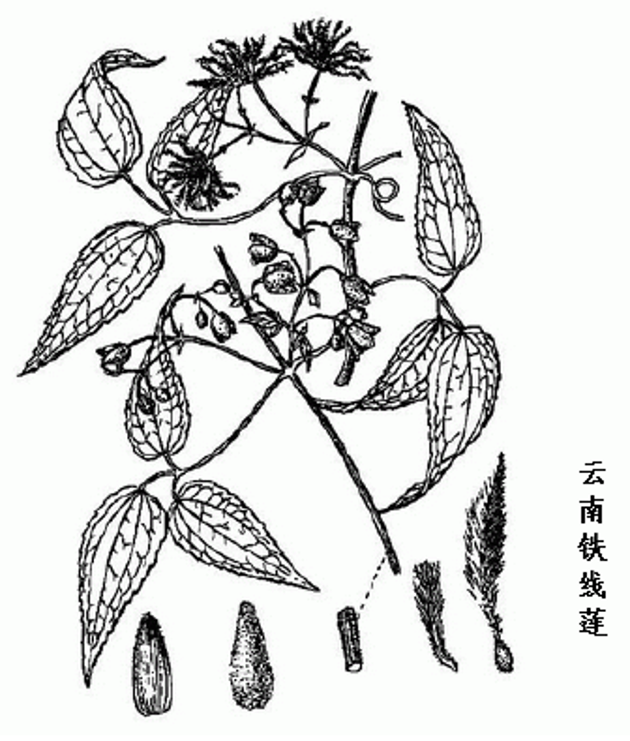 云南铁线莲属本质藤本。茎褐色,幼时被柔毛,后脱落无毛。叶对生,三出复叶;叶柄长3-5cm,被疏柔毛;小叶片卵状披针形或宽披针形,长5-10cm,宽1.5-4cm,先端尾状渐尖,基部圆形,边缘有整齐的锯齿,齿尖具细尖头,或有时全缘,上面或仅主脉有毛,下面被疏毛或近无毛,基出主脉3条,顶生小叶柄长1-3cm,侧生小叶柄长不到1cm,微被柔毛或近无毛。聚伞花序腑生,比叶短,3-7朵花,花序梗长1-3cm,被短柔毛,花序分枝处有一对披针形苞片,长1-2cm;花两性,钟状,直立,直径1.5cm,花梗长1-3cm;萼片4,卵圆形或狭卵形,长1.2-1.5cm,宽4-5mm,白色或淡黄色,先端钝尖,基部近圆形,外面及边缘被绒毛,内面无毛;花瓣无;雄蕊多数,长1.2-1.5cm,花丝线形,两侧生长柔毛,基部被短柔毛;心皮多数,被绢状毛。瘦果卵形,长2-3mm,被短柔毛,宿存花柱羽毛状,长2.2cm。花期11-12月,果期翌年4-5月。