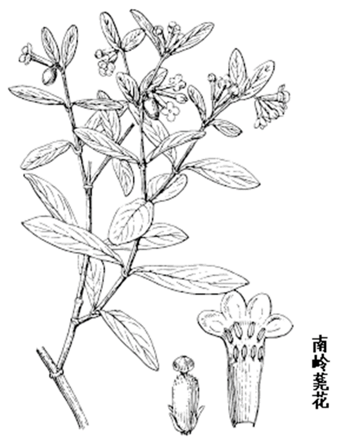 南岭荛花属半常绿小灌木,高达1m。全株平滑无毛。茎直立,多分枝,幼枝红褐色。根皮和茎皮富含绵状纤维,不易折断。叶对生,几无柄;叶片倒卵形至长椭圆形,长2-5cm,宽0.8-1.5cm,先端钝或短尖,全缘,基部楔形,侧脉多数,极纤细,干时褐色。花黄绿色,数花簇生于枝顶,排成聚伞状伞形花序或呈近无柄的头状花序;花两性,无苞片,花被管状,先端4裂,无毛;雄蕊8,成上下两轮着生花被管内,花丝短,花药椭圆形;子房倒卵形或长椭圆形,具圆头状柱头。核果卵形或椭圆形,熟时鲜红色。花果期夏、秋季。