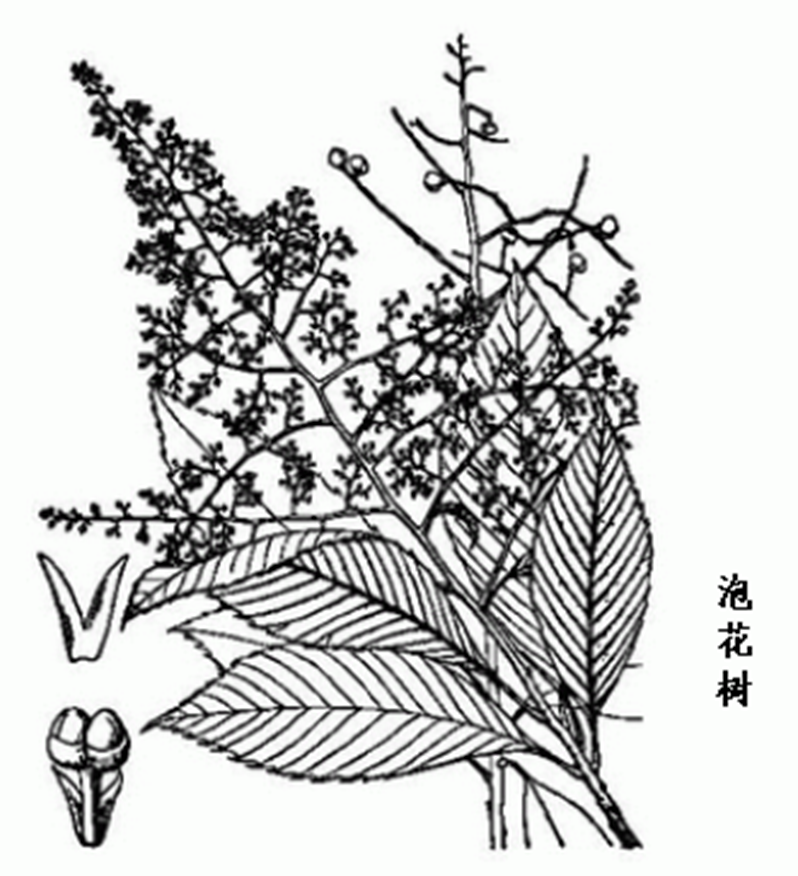 1.泡花树属落叶灌木或乔木,高3-9m。树皮黑褐色,小枝暗黑色,无毛。单叶互生;叶柄长1-2cm;叶片倒卵状楔形或狭倒卵状楔形,长8-12cm,宽2.5-4cm,先端短渐尖,中部以下渐狭,约3/4以上具侧脉伸出的锐尖齿,叶面初被短粗毛,叶背被白色平伏毛;侧脉每边16-20条,纸质。花两性,圆锥花序顶生,长15-20cm,被短柔毛;萼片5,宽卵形,外面2片具缘毛;花瓣5,外面3片近圆形,有缘毛,内面2片较小,2裂达中部,裂片狭卵形,锐尖,外边具缘毛;发育雄蕊2,长1.5-1.8mm;花盘具5细齿;雌蕊长约1.2mm,子房高约0.8mm。核果扁球形,直径6-7mm,核三角状卵形,顶基扁,腹部近三角形,具不规则的纵条凸起或近平滑,中肋在腹孔一边显著隆起延至另一边,腹孔稍下陷。花期6-7月,果期9-11月。