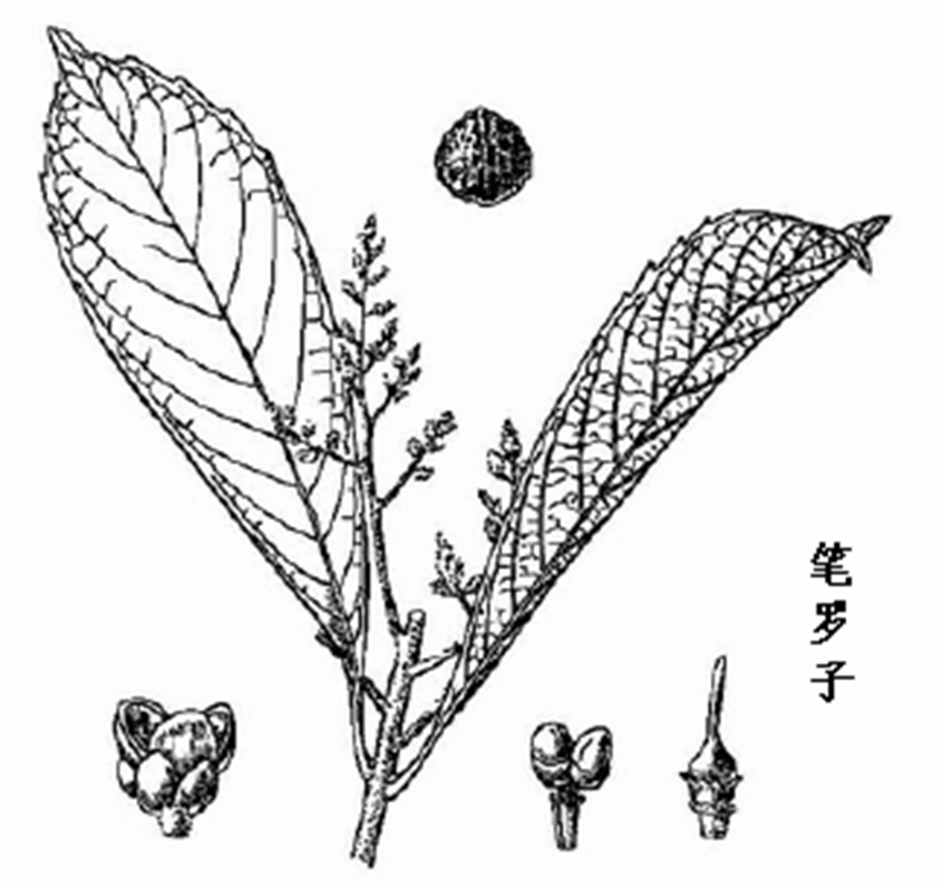 2.笔罗子属乔木,高达7m。芽、幼枝、叶背中脉、花序均被绣色长绒毛。单叶;叶柄长1.5-4cm;叶片倒披针形或狭倒卵形,长8-25cm,宽2.5-4.5cm,先端渐尖或尾状渐尖,基部渐狭楔形,全缘或中部以上有数个尖锯齿,叶背被锈色柔毛;侧脉每边9-18条;革质。花两性,圆锥花序顶生,主轴具3棱;萼片5或4,卵形或近圆形,有缘毛;花瓣5,白色,外面3片近圆形,直径2-2.5mm,内面2片长约为花丝之半,2裂;先端具数缘毛;发育雄蕊长1.2-1.5mm;子房无毛。核果球形,直径5-8mm;核球形,稍偏斜,具凸起细网纹。花期夏季,果期9-10月。
