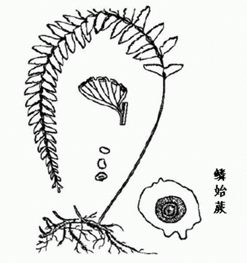 鳞始蕨为鳞始蕨科植物鳞始蕨的全草。根状茎圆柱形,表面密生条状钻形鳞片,上方近生多数叶,下方有众多的须根。叶柄禾秆色,长4-7cm;叶片条状披针形,长10-14cm,宽约2cm,羽片有短柄,半圆状斜三角形,宽4-5mm,下缘平直,全缘,上缘稍呈弧形突起,有缺刻;孢子囊群生于两缺刻之间,横跨2-4条小脉顶端,囊群盖边缘略啮断状。气微,味淡。