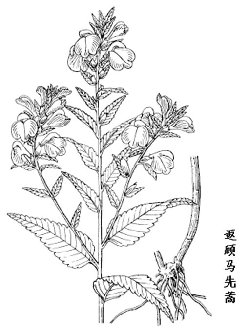 返顾马先蒿属多年生草本,高30-70cm。根多数丛生,细长而纤维状。茎常单生,直立,上部分枝,粗壮,中空,方形有棱。叶互生或对生;叶柄短,上部叶近无柄,无毛;叶片膜质至纸质;卵形至长圆状披针形,长2.5-5.5cm,宽1-2cm,先端渐窄,基部楔形或圆形,边缘有钝圆的重锯齿,两面无毛或有疏毛。花单生于茎枝顶端的叶腋中;无梗或有短梗;萼长卵圆形,膜质,前方深裂,齿仅2枚,宽三角形,全缘或略有齿,光滑或有微缘毛;花冠淡紫红色,长2-2.5cm,管长1.2-1.5cm,向右扭旋,上唇盔状,扭向右方,下唇大,有缘毛,3裂,中裂较小;雄蕊花丝前面一对有毛;花柱伸出喙端。蒴果斜长圆状披针形,长1-1.6cm。花期6-8月,果期7-9月。