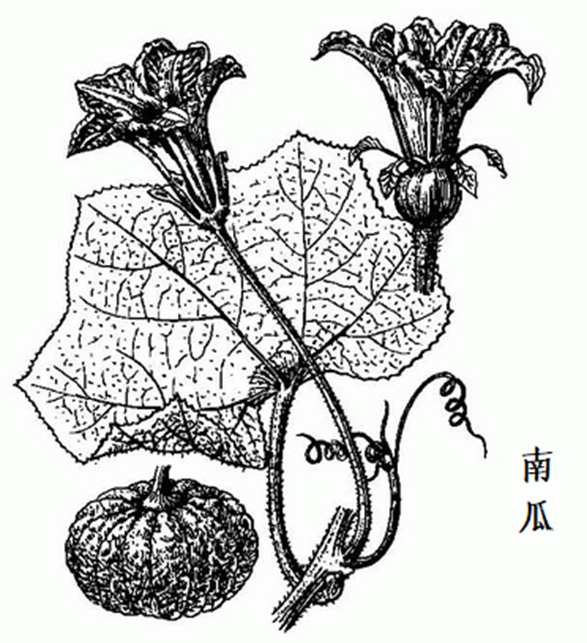 南瓜为一年生蔓生草本,茎长达2-5m。常节部生根,密被白色刚毛。单叶互生;叶柄粗壮,长8-19cm,被刚毛;叶片宽卵形或卵圆形,有5角或5浅裂,长12-25cm,宽20-30cm,先端尖,基部深心形,上面绿色,下面淡绿色,两面均被刚毛和茸毛,边缘有小而密的细齿。卷须稍粗壮,被毛,3-5歧。花单性,雌雄同株;雄花单生,花萼筒钟形,长5-6mm,裂片条形,长10-15mm,被柔毛,上部扩大成叶状,花冠黄色,钟状,长约8cm,5中裂,裂片边缘反卷,雄蕊3,花丝腺体状,长5-8mm,药室折曲;雌花单生,子房1室,花柱短,柱头3,膨大,先端2裂,果梗粗壮,有棱槽,长5-7cm,瓜蒂扩大成喇叭状。瓠果形状多样,外面常有纵沟。种子多数,长卵形或长圆形,灰白色。花期6-7月,果期8-9月。