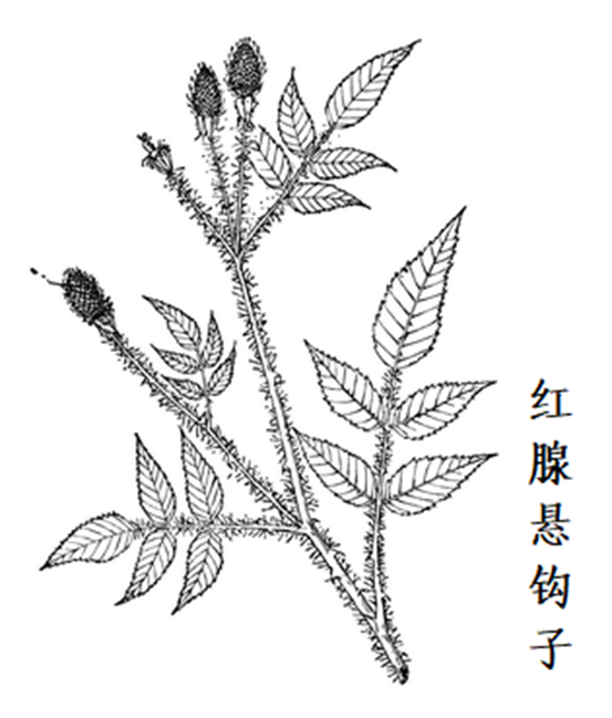 红腺悬钩子 直立或攀援灌木,高40-60cm。枝、叶轴、叶柄、花序轴和花梗均有红色刚毛状腺毛和钩刺。奇数羽状复叶,长5-12cm;小叶5-7,稀3;有短柄或近无柄;叶纸质,卵状披针形至披针形,长2.5-5cm,宽1.5-2.5cm,先端渐尖,基部圆形,偏斜,边缘具齿,两面疏生柔毛,沿中脉较密,下面沿中脉有小钩刺;托叶条形。花3朵或数朵成伞房状花序,稀单生;花白色,直径1-2cm;萼裂片外面有腺毛和短柔毛,内面密生短柔毛,结果时反折;花瓣椭圆形,具爪。聚合果长圆形,长1-1.5,橘红色。花期4-6月,果期7-8月。