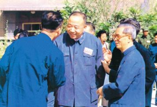 方毅副总理(右)及甘肃省委书记与袁承业(中)在金川会议期间交谈