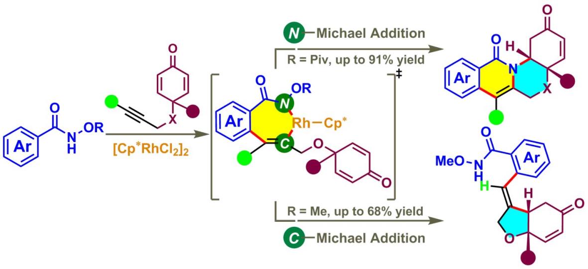 最近,该课题组成功地实现了三价铑催化的N-甲氧基以及N-特戊酰基氧苯甲酰胺和1,6-烯炔的可调控的芳化环化反应。首先,苯甲酰胺和1,6-烯炔在三价铑的催化下,通过C(sp2)?H活化形成一个七元铑环中间体。当R为特戊酰基时,七元铑环中间体马上发生碳-氮还原消除以及氮-氧氧化加成的过程而生成异喹啉,异喹啉再发生氮杂Michael加成反应而构建了一个四环产物;另一方面,当R为甲氧基时,七元铑环中间体则不经历一个碳-氮还原消除的历程而直接经过碳-Michael加成反应而得到一个三环产物(J. Am. Chem. Soc.2014,136, 15607)。此外,通过对机理的仔细研究揭示了碳氢活化依然是这两个串联反应的决速步骤。