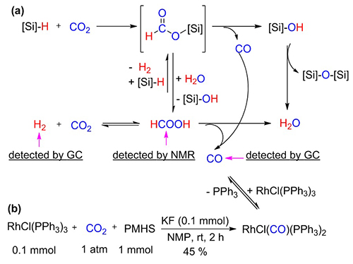 初步的机理研究(图二)表明,CO2在Lewis碱性溶剂NMP中首先被PMHS还原成CO,并伴随形成了少量的H2和HCOOH。从CO2还原所生成的CO在金属铑膦络合物催化下与H2和烯烃发生氢甲酰化,从而得到了相应的醛。在醛和CO2同时存在的反应体系中,CO2优先与硅烷PMHS 反应,直至后者消耗殆尽,从而保持醛不被还原为相应的醇。