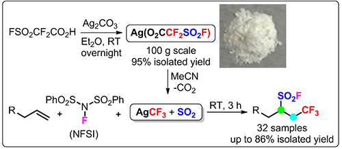图三、Ag(O2CCF2SO2F)试剂制备和对烯烃的氧化自由基三氟甲基化氟磺酰基化