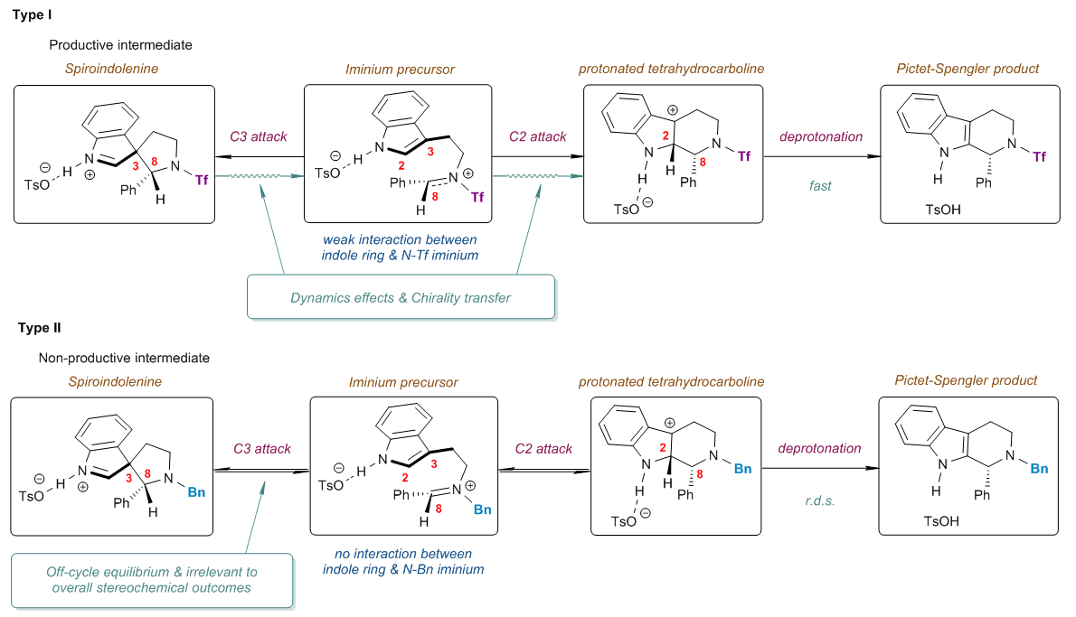 基于上述结果研究人员意识到Pictet–Spengler反应前体I中亚铵正离子部分的电子性质可能对反应历程和立体化学有重要影响。深入的DFT计算表明当I中氮原子上带有强吸电子基团时(PG = Tf),螺环假吲哚中间体III可以发生有效的扩环迁移反应。亚铵正离子和吲哚环之间较强的相互作用使得迁移反应经历了典型的火山口型势能面(Caldera shape PES),迁移反应很可能具有显著的动态学效应(Dynamics effects)。轨线分析(Trajectory analysis)证实螺环假吲哚中间体III可以通过快速的迁移反应(平均时间尺度为数百飞秒)生成质子化四氢-β-咔啉II。该迁移反应过程中亚铵正离子部分的立体化学完全保持。当I中氮原子上带有强给电子基团时(PG = Bn),螺环假吲哚中间体III的形成是一个可逆过程,与Pictet–Spengler反应最终产物的形成没有直接关系(图2)。在此基础上,研究人员提出Pictet–Spengler反应可能经历的两种极限机理(图3)。螺环假吲哚中间体可以作为“产出性中间体(Productive intermediate)”或者“非产出性中间体(non-Productive intermediate)”参与Pictet–Spengler反应。螺环假吲哚中间体的立体化学信息可能通过立体专一性的扩环迁移过程传递至最终产物中。该理论预测也已被进一步实验结果所证实。研究人员还将此机理模型推广至一系列已知的催化不对称Pictet–Spengler反应中,通过两个易算的能量参数可以方便地对某一给定的Pictet–Spengler反应的历程做出快速判断。关于Pictet–Spengler反应的统一机理认识有助于进一步挖掘螺环假吲哚中间体的反应性能,以及发展针对吲哚多环化合物的新型合成方法。