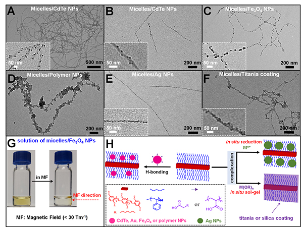 他们以P2VP壳层中吡啶基团为氢键受体,通过羧酸与吡啶间氢键作用,将表面包覆羧酸、具有光电磁性能的功能纳米粒子(CdTe量子点、Au和Fe3O4纳米粒子及聚合物球形胶束)负载在纳米纤维表面(图2);利用P2VP壳层中吡啶基团与金属和金属氧化物间络合作用,通过原位还原将Ag纳米粒子负载于壳层中;通过原位溶胶-凝胶反应,在纳米纤维表面原位形成SiO2和TiO2层(图2)。结果表明表面功能化均不会破坏纤维结构的完整性,不会引起纤维胶束断裂或聚集。