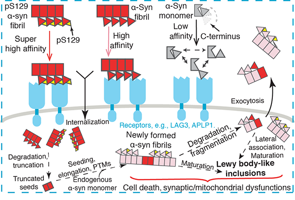 本工作首先通过多种生物物理技术手段的联合应用,在分子层面阐释了不同细胞表面受体,包括LAG3(lymphocyte activation gene3)和APLP1(amyloid precursor-like protein 1)特异性识别α-syn病理纤维的分子机制。首次发现α-syn的C末端是其结合不同膜表面受体蛋白的正电口袋的关键区域,并且α-syn在单体状态下其C末端与其它区域(N末端及中间的纤维形成核心区)存在长程弱相互作用,这使得α-syn的C末端在单体状态下以动态自锁的形式存在,不利于其与受体结合。而在纤维状态下,α-syn的C末端被释放并高度富集在纤维表面,从而显著增强α-syn纤维与受体的结合能力。进一步的细胞和小鼠研究表明,α-syn的C末端是膜受体介导的α-syn病理纤维细胞间传播的关键区域,介导α-syn病理纤维进入到细胞中,诱导细胞内源非聚集态的α-syn病理性聚集,并引发相应的细胞毒性和死亡等。最重要的是α-syn的C末端S129位磷酸化修饰不但能够极大地提升α-syn纤维与受体蛋白之间的结合力,还能够加速α-syn纤维在神经元中的内吞、聚集和传播,增强α-syn纤维的神经毒性,并加重小鼠模型中的PD相关症状。