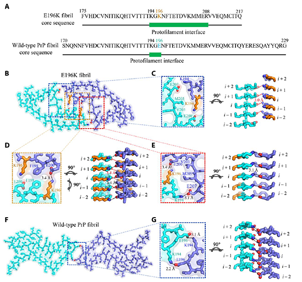 2021年9月9日,中国科学院上海有机化学研究所生物与化学交叉中心刘聪课题组与武汉大学梁毅课题组合作在Science Advances上在线发表题为Genetic prion disease–related mutation E196K displays a novel amyloid fibril structure revealed by cryo-EM的研究成果。该工作利用冷冻电镜技术解析了全长朊病毒蛋白家族遗传病理性突变体E196K蛋白纤维的近原子分辨率结构,发现了E196K突变通过破坏野生型朊病毒蛋白病理纤维中的关键相互作用力,导致了纤维结构的重排,进一步揭示了不同朊病毒蛋白病理突变体聚集多态性的分子机制。