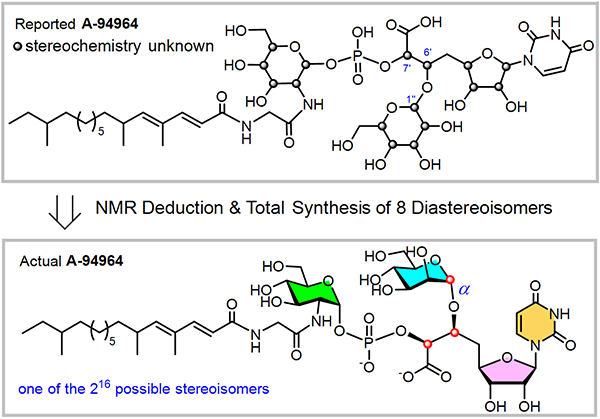 日本东京大学Kuzuyama课题组通过发酵和纯化,提供了约3毫克的A-94964样品。意大利那不勒斯费德里科二世大学的Molinaro和Silipo课题组通过高场核磁共振技术,推测了其中的呋喃糖环和2个吡喃糖环的结构,它们分别是β构型的核糖、α构型的氨基葡萄糖和β构型的甘露糖。但是,其中对于甘露糖异头位构型的指认基于其碳氢耦合常数1JC1’’-H1’’的数值(165 Hz),结论较勉强;而且,由于C6’位和C7’位处在柔性侧链,其立体构型无法根据核磁数据来确认。而不饱和脂肪酸链在天然核苷类抗生素中具有不均一性,其中的手性中心尚无法探究。