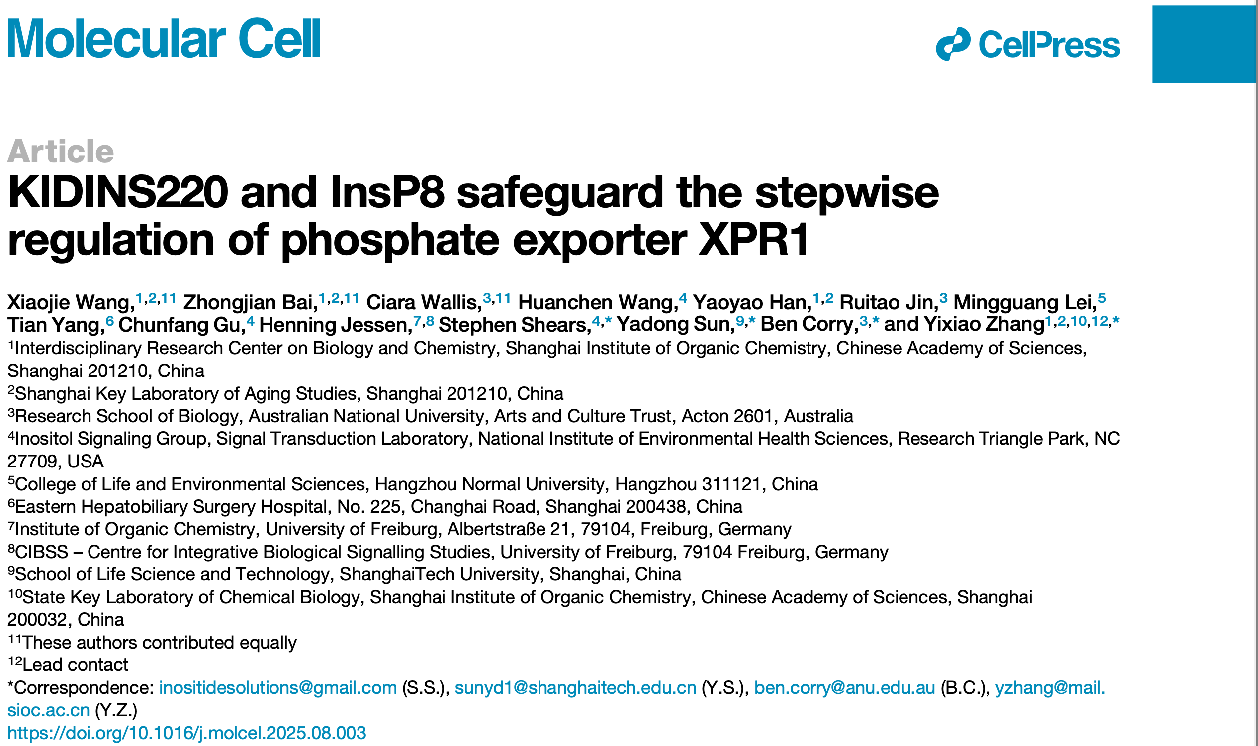 近日,中国科学院上海有机化学研究所生物与化学交叉研究中心、生命过程小分子调控国家重点实验室张一小课题组,联合澳大利亚国立大学Ben Corry课题组、上海科技大学孙亚东课题组以及美国国立环境健康科学研究所Stephen Shears课题组,在Molecular Cell杂志上发表了题为“KIDINS220 and InsP8 safeguard the stepwise regulation of phosphate exporter XPR1”的研究文章。该研究通过结构解析、功能研究、计算模拟等手段揭示了XPR1一种精细的“key-to-locks”活性调控方式,以及一种独特的“knock-kiss-kick”磷酸转运外排机制,阐明了原发性脑钙化相关突变的致病机理,并发现了磷酸外排同源蛋白XPR1、PXo、PHO1在进化上的保守性和差异性。