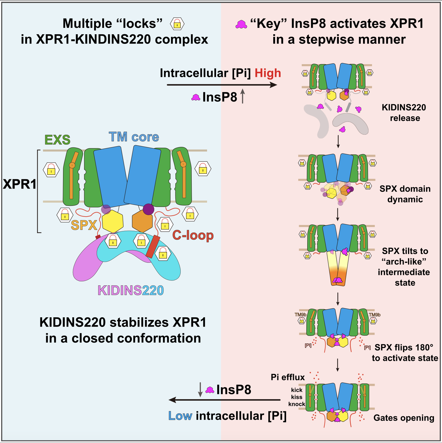 “Key-to-locks”活性调控方式:本研究通过冷冻电镜解析了XPR1与神经元支架蛋白KIDINS220复合物以及XPR1与InsP8复合物的高分辨三维结构,捕捉到XPR1激活过程中的多种功能状态。结合功能实验,本研究发现KIDINS220能将XPR1稳定在关闭状态,存在多重限制机制来给磷酸盐外排活性上“锁”。而天然底物InsP8,这一分子犹如“钥匙”,能够诱发XPR1的逐步激活:(1)在关闭状态中,KIDINS220能够与XPR1的不同基序结合,将XPR1的SPX结构域牢牢锁定在非翻转的关闭状态。其中,XPR1的α1螺旋形成interaction hub来稳定该构象。只有在InsP8存在并与XPR1的α1螺旋结合时,这一限制及其他内部约束才能被解除;(2) 在关闭状态中,XPR1的C-loop形成“盖子”,遮挡住胞内入口。InsP8诱导SPX结构域发生逐步构象重排,并发生180度的大翻转。翻转后的SPX暴露出与C-loop的结合界面,将胞内入口打开,从而解除第二重限制;(3)XPR1的TM9b螺旋控制着外侧出口,当TM9b向外运动并扩大外侧通道时,磷酸基团才能顺利转运至胞外(图1)。综上所述,XPR1的激活需要依次解除由KIDINS220、α1螺旋、C-loop和TM9b螺旋等形成的多重限制,从而实现孔道开放,这一“key-to-locks”机制揭示了XPR1活性的精细调控模式。