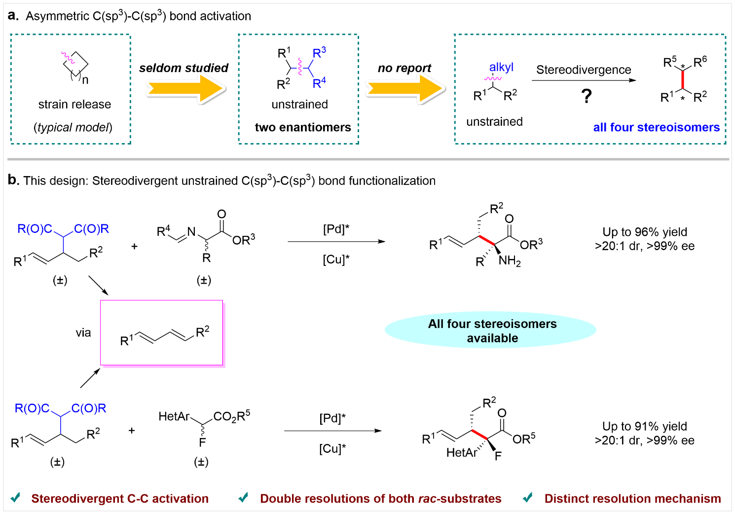 从相同底物出发,通过立体发散性合成获取目标分子所有构型的转化方法,近年来引起了广泛关注。目前,基于烯丙位杂原子离去基和不饱和烃的立体发散型合成有较多的探索。相比之下,同时断裂非张力烷基碳-碳键并精确调控双立体中心的合成具有较高的挑战性,尚未有研究报道(图1)。近日,金属有机化学全国重点实验室何智涛课题组在Angew. Chem. Int. Ed. 上在线发表了题为 “Stereodivergent Alkylation of Unstrained C(sp3)-C(sp3) Bonds”的研究论文。该工作报道了一种金属/配体调控的立体发散合成策略,通过消旋的烯丙基底物与消旋的氨基酸酯或氟代吡啶酯间的反应,同时制备了四种立体构型的产物。非张力烷基碳-碳键的立体发散性转化展现出良好的反应活性、对映选择性和非对映选择性控制效果。不同于传统的去消旋化观点,一系列机理实验表明,该反应是通过共轭二烯中间体的形成来实现消旋底物的高效去消旋化。