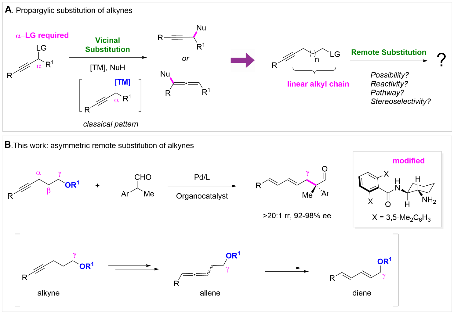 烷基碳氧键广泛存在于天然产物和活性分子等结构中。其参与的直接转化通常需借助高效的氧原子活化试剂或者邻位活化基团的存在。特别是在不饱和烃中,如何抑制高活性π键体系、选择性实现烷基碳氧键的转化是一个具有高挑战性的难题。近日,金属有机化学全国重点实验室何智涛课题组在Science Advances上发表了题为“Outcompeting hydrofunctionalization: asymmetric remote substitution of alkynes”的研究论文。该工作报道了一例钯/胺协同催化的体系,利用手性胺活化醛作为亲核试剂,高收率、高选择性地实现了炔烃异构驱动远端惰性C-O键的不对称取代(图1)。所得到的产物可进一步合成多种手性分子骨架。其中,改良的伯胺有机催化剂,能够明显提高反应的立体选择性控制效果。机理研究表明,反应的关键在于钯催化剂精准调控β-消除基元过程,将炔烃高效异构化为共轭二烯,从而实现远端C-O键的活化转化。
