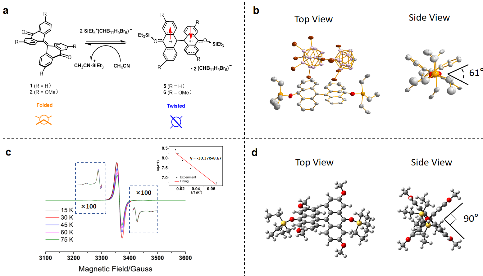 传统实现碳碳双键扭转主要依赖空间位阻或外部高能刺激(如光照,加热等,图1a-c),往往导致不可逆结构变化或仅能获得亚稳态物种。王新平团队创新性地利用路易斯酸与二蒽酮骨架中羰基氧的配位作用(图2),系统性调控分子内电子分布,从而在温和条件下诱导碳碳双键发生可控、大幅扭转(最高72.2°),形成结构明确、在室温下稳定的双自由基态。该过程通过单晶X射线衍射、电子顺磁共振(EPR)及超导量子干涉仪(SQUID)等多种手段得到了充分证实。更重要的是,通过加入强路易斯碱(如CH₃CN)可竞争性置换路易斯酸,使体系完全恢复至原始折叠烯烃结构,实现了“配位‑去配位”驱动的可逆转换。