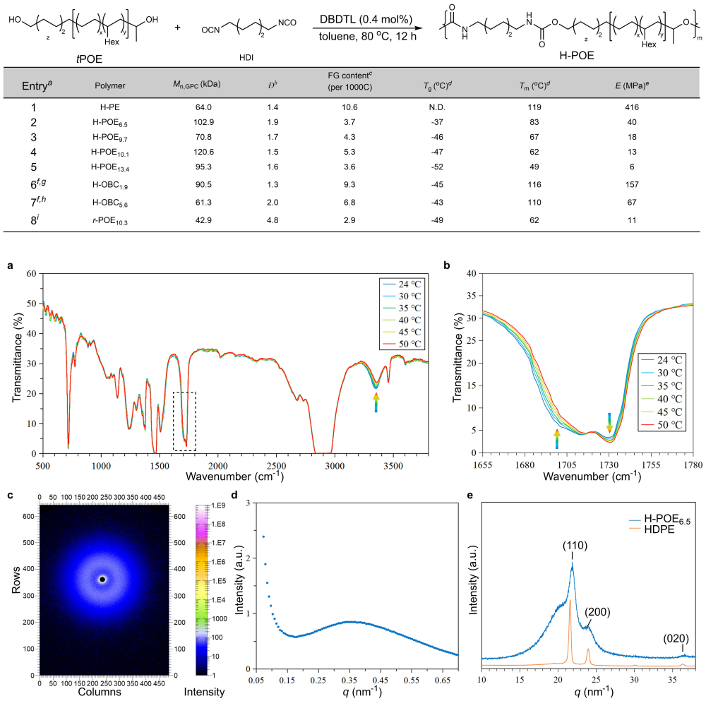 中国科学院上海有机化学研究所唐勇/高彦山团队致力于利用乙烯、丙烯等大宗烯烃单体,发展可持续、功能化聚烯烃材料(J. Am. Chem. Soc. 2025, 147, 3931−3936; Nature Commun. 2024, 15, 1462; Prog. Polym. Sci. 2023, 143, 101713)。近期,与四川大学傅强教授合作,通过在聚烯烃主链中嵌入氨基甲酸酯基团,成功开发出一种兼具高强度、高韧性且可闭环回收的新型聚烯烃弹性体H-PO,为可持续高性能高分子材料的设计提供了新思路(图1)。研究团队以遥爪型双羟基聚烯烃(tPO)和六亚甲基二异氰酸酯为原料,通过逐步聚合反应在聚烯烃主链中引入了氨基甲酸酯键。合成聚合物分子量均高于50 kDa,并采用变温红外、SAXS、WAXD对其结构进行了系统表征(图2)。