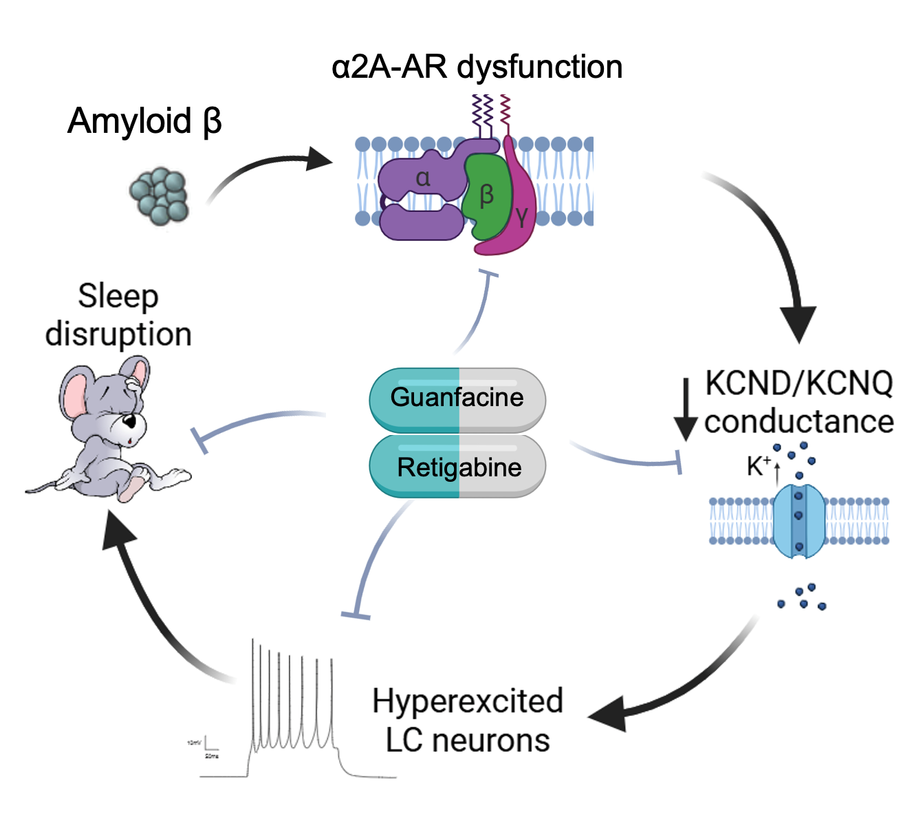 该研究团队利用5xFAD转基因AD小鼠模型,通过睡眠监测、全细胞膜片钳、药理学调控等多种技术手段,发现早在2月龄5xFAD小鼠即出现暗周期特异性觉醒过度及脑状态转换能力下降。机制上,研究人员发现蓝斑(Locus Coeruleus, LC)神经元出现暗周期时相特异性自发放电频率升高,其底层机制是Aβ寡聚体干扰了负责维持蓝斑神经元正常活动水平的α2A型去甲肾上腺素受体功能,使其对两种负责神经元活性“刹车”作用的电压门控钾离子通道4(Voltage gated potassium channel 4, Kv4)与电压门控钾离子通道7(Voltage gated potassium channel 4, Kv7)的正常调节失灵,进一步导致了蓝斑神经元兴奋性在暗周期异常升高。