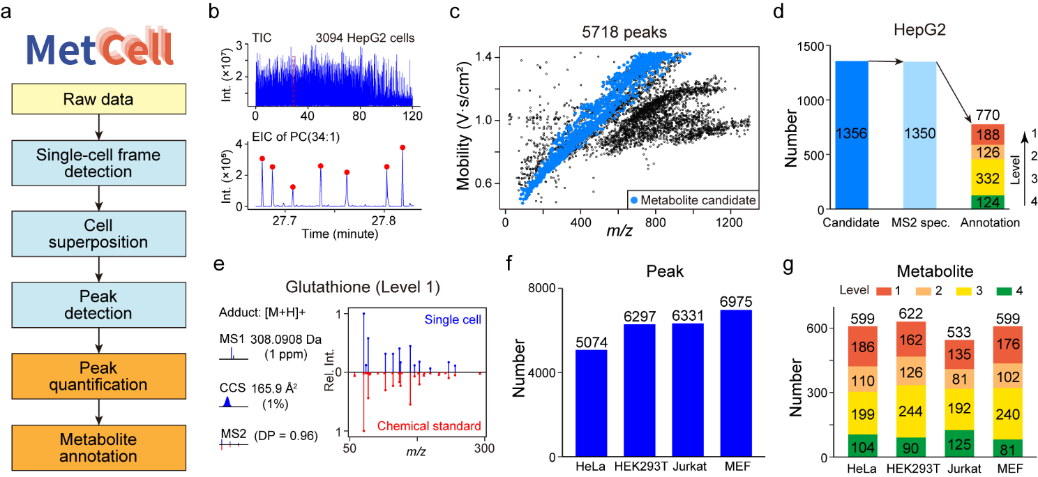 结合离子淌度质谱流式单细胞代谢组分析的技术优势,研究团队进一步开发了面向该技术的自动化高效数据处理算法和软件MetCell(图 2)。在对 HepG2 细胞进行 120 分钟连续采集的数据中,MetCell 共识别出 3094 个单细胞事件,检测到 5718 个代谢物离子峰,并通过多维匹配成功注释 770 个代谢物。在多种常见细胞系中,MetCell 可检测 5074–6975 个代谢物峰,并注释 533–622 个代谢物,相比现有报道技术,覆盖度提升了 3–10 倍。尤为重要的是,MetCell 在多种细胞系中共鉴定并利用化学标准品验证了 389 个 Level-1 代谢物,创造了迄今为止单细胞代谢组学研究中规模最大、注释最准确的记录。