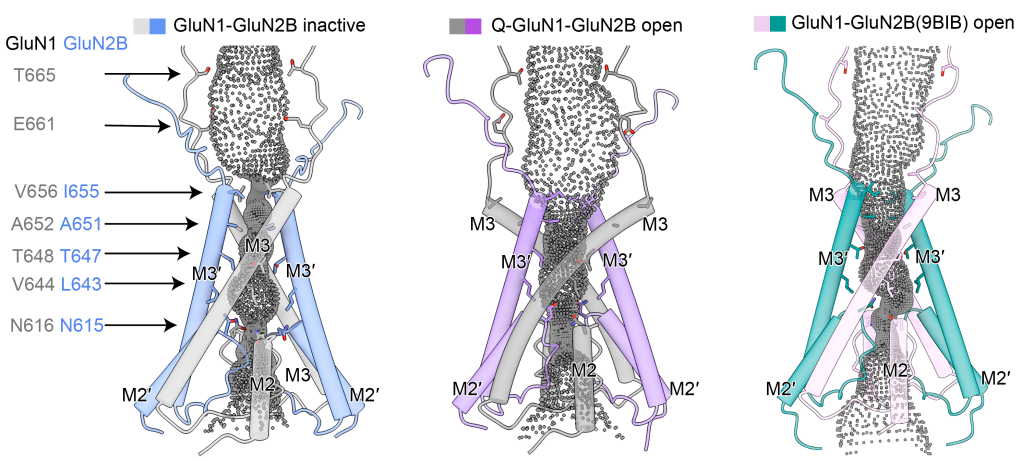 尤为重要的是,研究团队在内源性 GluN1-GluN2B 受体中捕获到一个此前从未观察到的完全开放构象。该结构显示,通道门控M3 helix在 GluN1 和 GluN2B 两个亚基中均发生明显向外旋转,导致离子通道孔径显著扩大,从而实现真正意义上的通道开放。这一发现解决了 NMDA 受体研究领域长期存在的关键问题,为理解配体结合如何驱动通道完全开启提供了直接的结构证据。