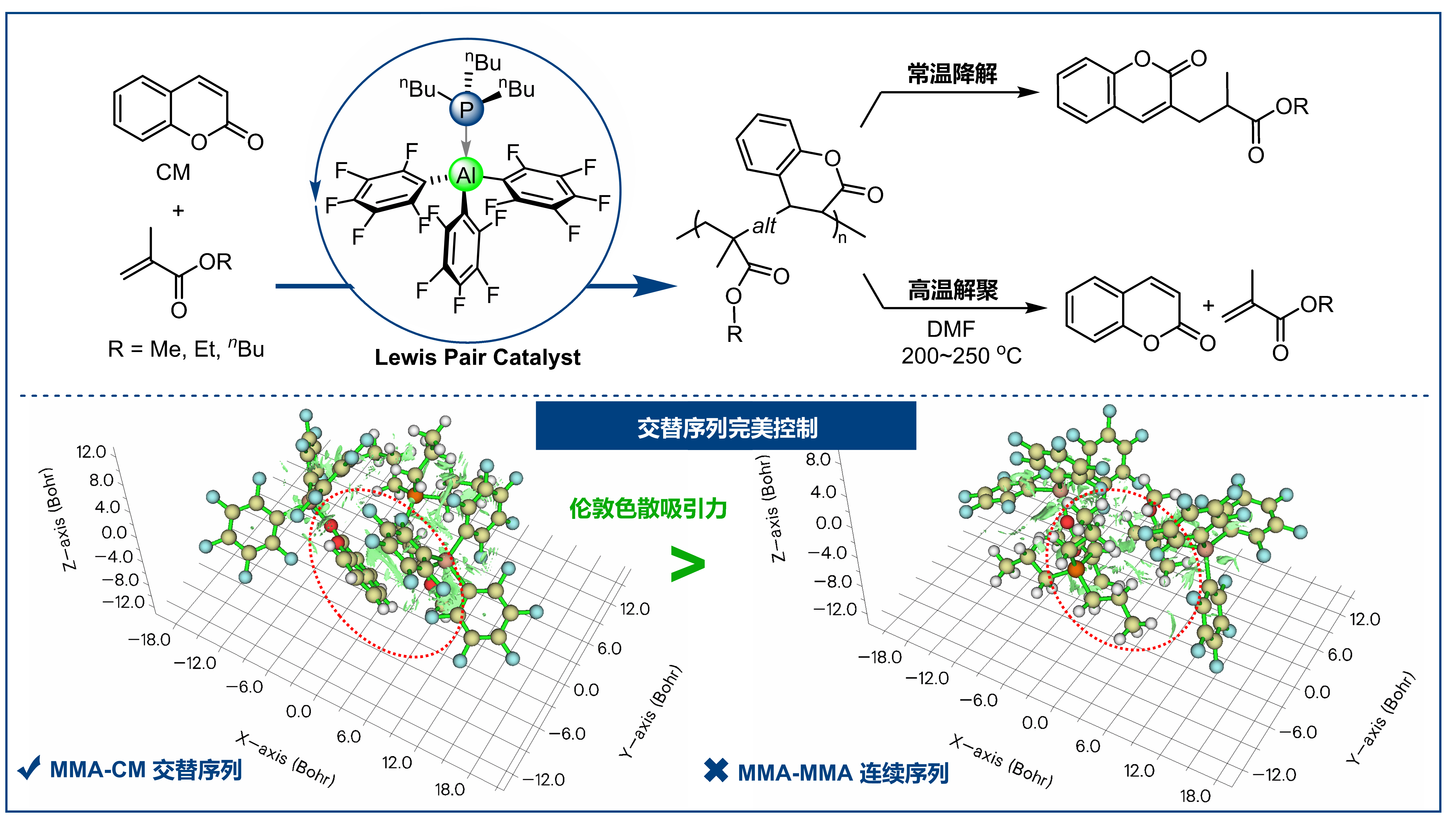 图1. Al/P LP催化甲基丙烯酸酯与香豆素共聚及交替序列控制机理